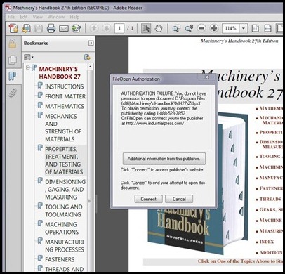Unfortunately, some changes in Adobe Reader X and Acrobat X are incompatable with Machinery's Handbook 27. That is the reason you are getting the message "FILEOPEN LOCK FAILURE(1)". You are likely to get this even if you have your Handbook authorized. The symptoms are most severe in Reader X. Problems in Acrobat X may not be as severe, although there will probably be some.